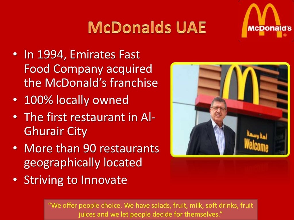 Mcdonald's uae today has significantly more than 110 restaurants and over 3000 employees to mcdonald's happens to be a family group name when you look at the uae and a working member.